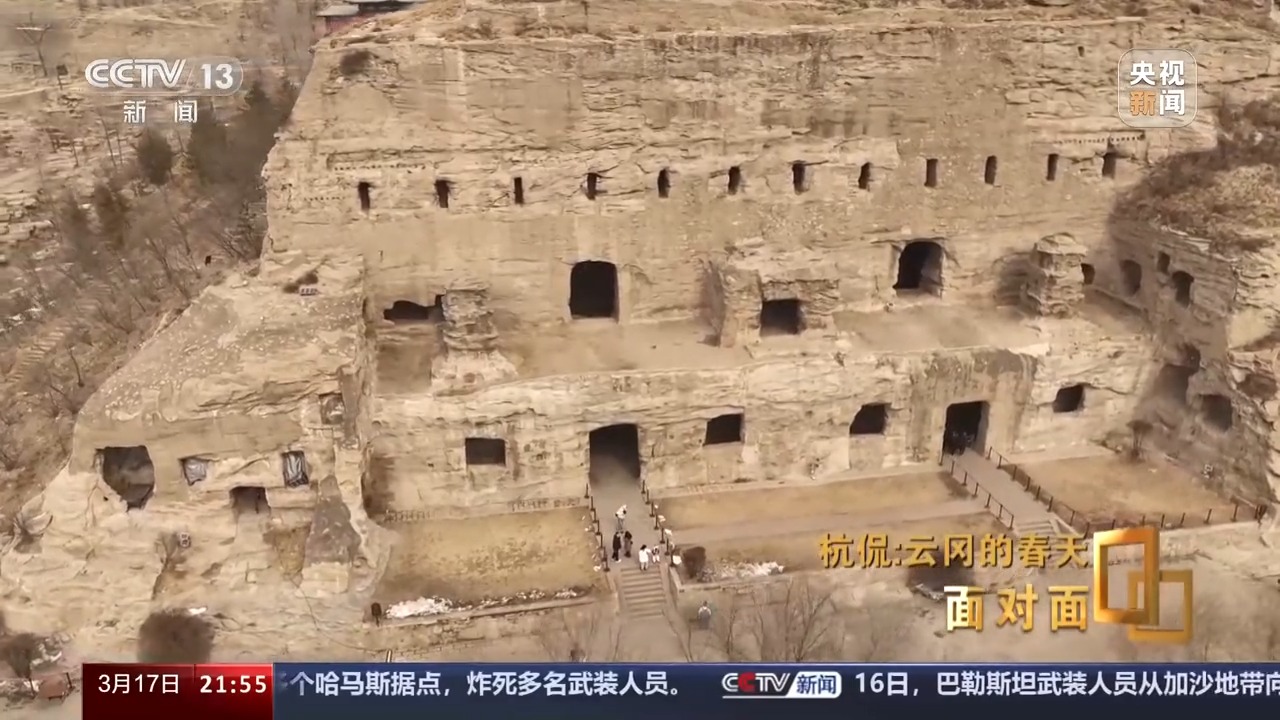 3月的山西大同,乍暖還寒,到訪云岡石窟的游客依舊熱情不減。跟隨云岡研究院院長杭侃,我們一起回望這段跨越1500多年的歷史。云岡石窟的開鑿始于北魏時期,它是佛教傳入中國后,第一次以皇家的力量主持開鑿的石窟群,有“真容巨壯”“窮諸巧麗”之譽。云岡石窟現存主要洞窟45個,附屬洞窟209個,大小造像5.9萬余尊,2001年被聯合國列入世界遺產名錄。第20窟露天大佛是云岡石窟的標志性景觀,然而,我們并沒有在這里過多停留,杭侃把我們帶到了他更感興趣的另一個地方。