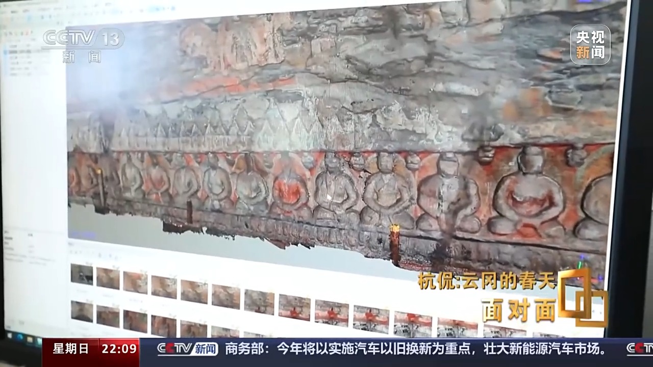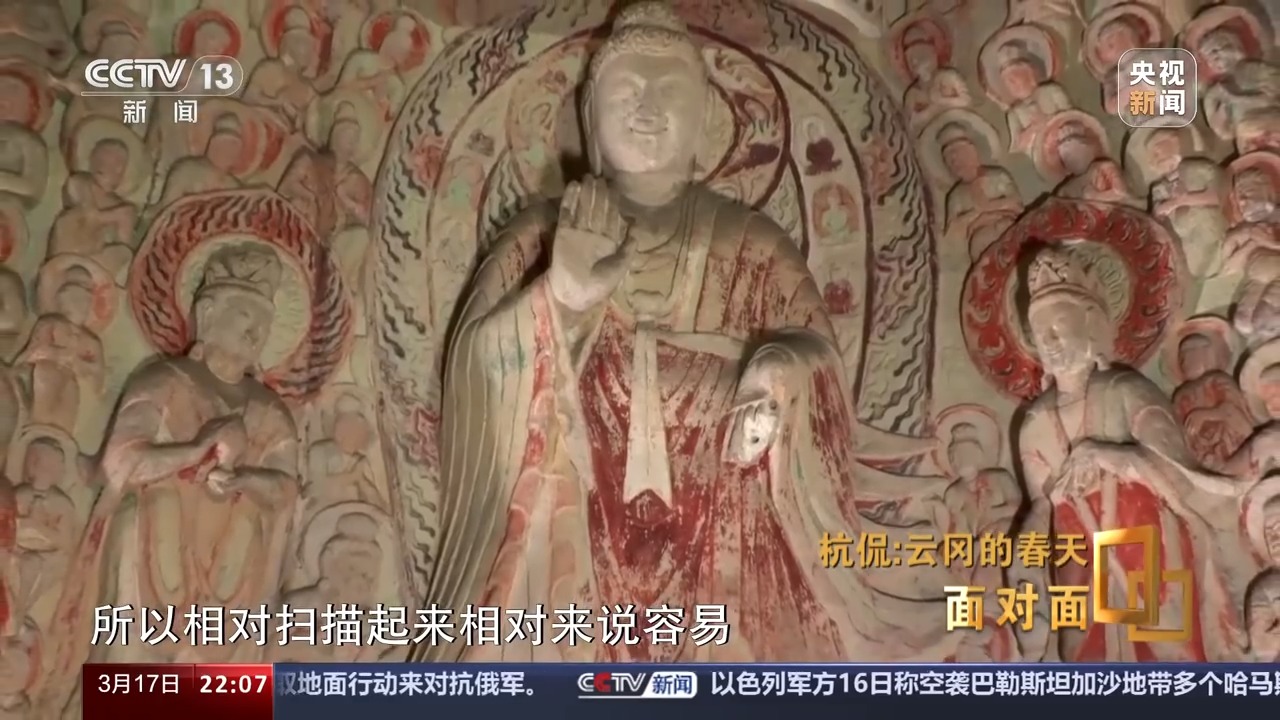杭侃:因為敦煌起步早,到現在都是我們學習的榜樣。但是敦煌它正是因為起步早,可能我們現在技術迭代比較快。所以從技術迭代的角度來說我們并不落后。我們現在的精度已經到了0.03毫米了,但是那樣需要的算力是非常大的。我們這有一個超算中心,超算中心是什么概念?就是你看到的一個洞窟的運算能力,要和一個中等城市的,我們叫智慧城市,那個量是一樣的。云岡它是一個皇家工程,所以那個像都特別大,敦煌它很多洞窟比較小,另外敦煌它的壁畫非常精彩,但是壁畫是二維的,所以相對掃描起來相對來說容易,但是我們這個地方它一個是大,第二個就是雕刻的手法多。所以像你看到的第六窟,我們到現在都沒有拿得出來,大家都能認可的采集方案。