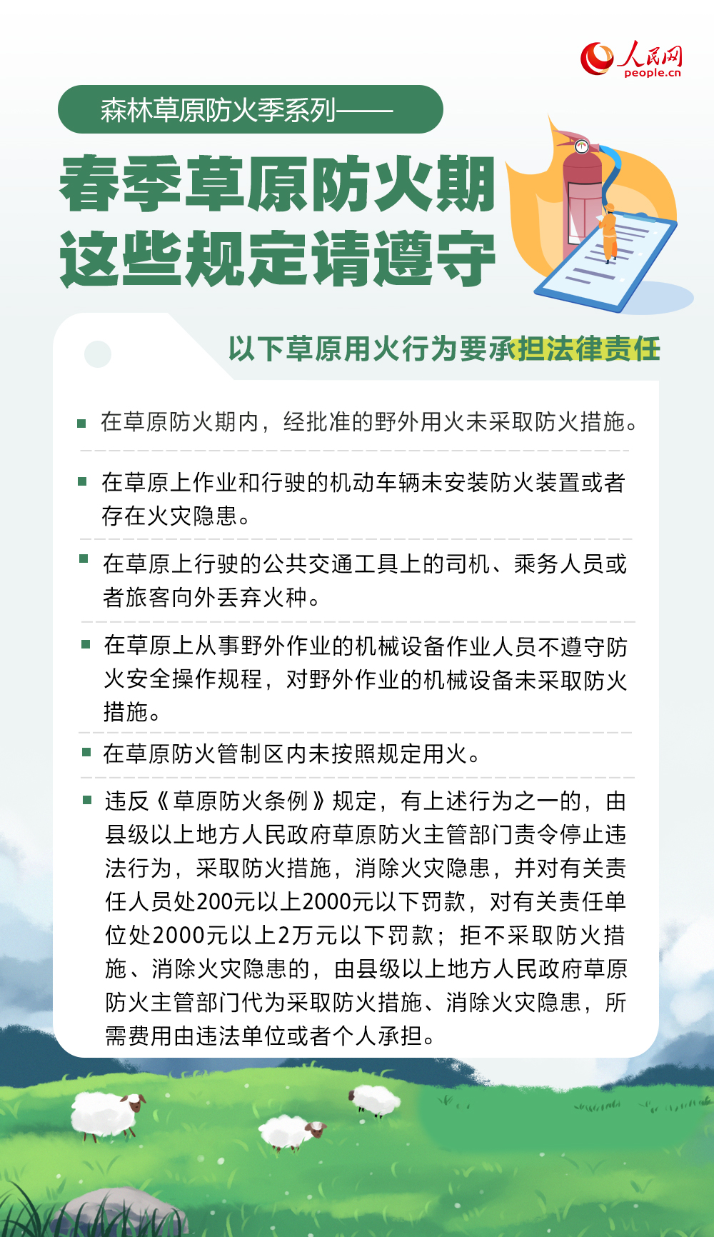 春季氣溫回升,風干物燥,是森林草原火災的高發(fā)期。草原防火期用火有哪些規(guī)定?哪些不當行為將承擔法律責任?一起來了解。