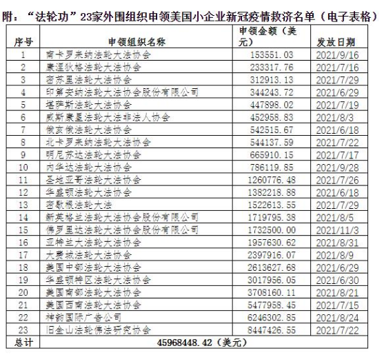 據(jù)美國小企業(yè)管理局網(wǎng)站公布新冠疫情期間“關(guān)閉場館運營商救濟金”申領(lǐng)名單,截至2022年7月5日,23個替“神韻演出”斂取錢財?shù)拿绹胺ㄝ喒Α蓖鈬M織,共計套現(xiàn)美國政府新冠疫情救濟金高達近4600萬美元(約合人民幣3.12億元),超過法定限額近3600萬美元。