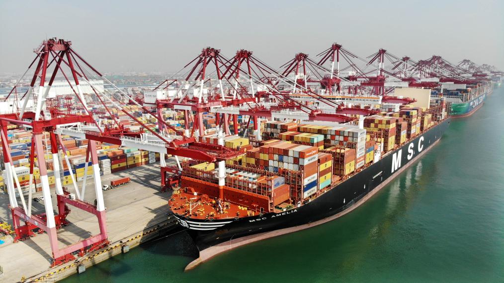 3月13日,貨輪在山東港口青島港裝卸集裝箱(無人機照片)。新華社記者 李紫恒 攝