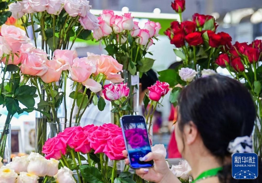 觀眾在國貨特色潮品展區(qū)云南展臺拍照,云南展臺為本屆消博會準(zhǔn)備了8000余支、20多個品種的云南本土鮮切玫瑰。新華社記者王楚天 攝