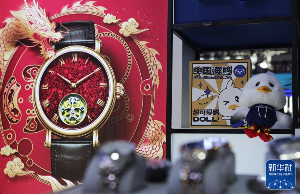 圖為天津館海鷗國潮風(fēng)格手表展柜。本屆消博會上,“老字號”帶來的國潮新品不僅有著海派文化和傳統(tǒng)文化元素,還與獨具匠心的年輕創(chuàng)意相融合。