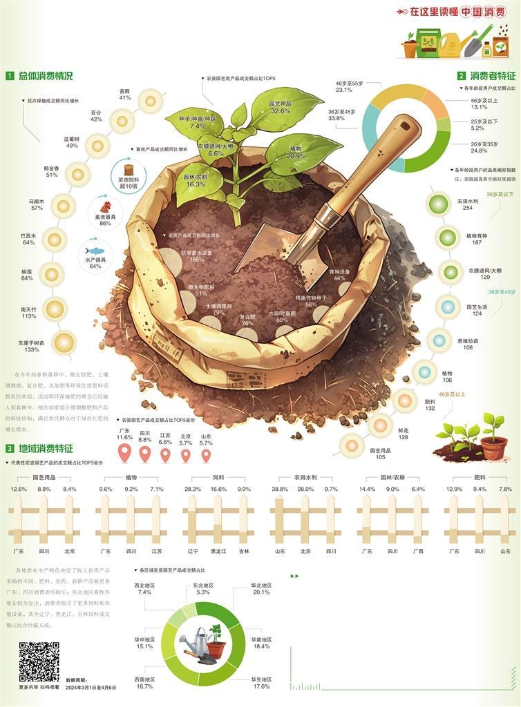 此外,畜牧業(yè)生產(chǎn)、城市花草種植需求也成為春耕消費的新亮點。鄉(xiāng)村養(yǎng)殖戶抓住春季時節(jié)推進畜禽填槽補欄,濃縮飼料、禽類器具、水產(chǎn)器具成為受歡迎的產(chǎn)品,其中濃縮飼料的成交額同比增長超10倍。城市居民購買了更多的花卉綠植,為自家陽臺、花園、辦公室增添濃濃春意,車厘子樹苗、南天竹、巴西木、郁金香是最受青睞的品類。