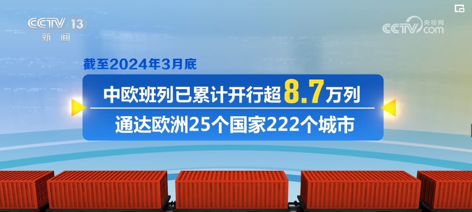 2024年一季度,中歐班列累計(jì)開(kāi)行4541列、發(fā)送貨物49.3萬(wàn)標(biāo)箱,同比分別增長(zhǎng)9%、10%。截至2024年3月底,中歐班列已累計(jì)開(kāi)行超8.7萬(wàn)列,通達(dá)歐洲25個(gè)國(guó)家222個(gè)城市。