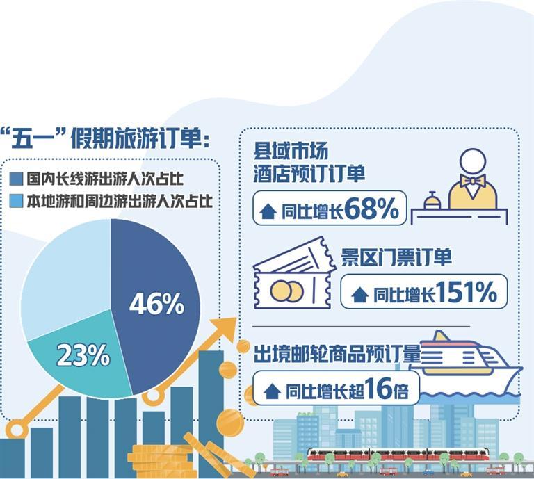 從出游目的地看,北京、上海、重慶、杭州、成都、南京、西安、武漢、廣州等城市是熱門,帶動(dòng)相關(guān)交通和酒店訂單量走高。去哪兒旅行網(wǎng)顯示,北京—上海、成都—西安、上?!錆h、深圳—長(zhǎng)沙、北京—青島等熱門線路的火車票預(yù)約購(gòu)票難度不低于春運(yùn);從上海、北京、深圳、廣州、杭州、南京等地出發(fā),飛往旅游城市的機(jī)票平均支付價(jià)格走高,北京—成都、上海—昆明等熱門航線的部分航班已升至全價(jià);在攜程旅行網(wǎng)上,天水、徐州、淄博、合肥、南昌、迪慶、煙臺(tái)等城市的“五一”假期酒店預(yù)訂增速明顯;四線及以下城市,尤其是縣域旅游市場(chǎng)帶來(lái)新增量,縣域市場(chǎng)酒店預(yù)訂訂單同比增長(zhǎng)68%、景區(qū)門票訂單同比增長(zhǎng)151%。