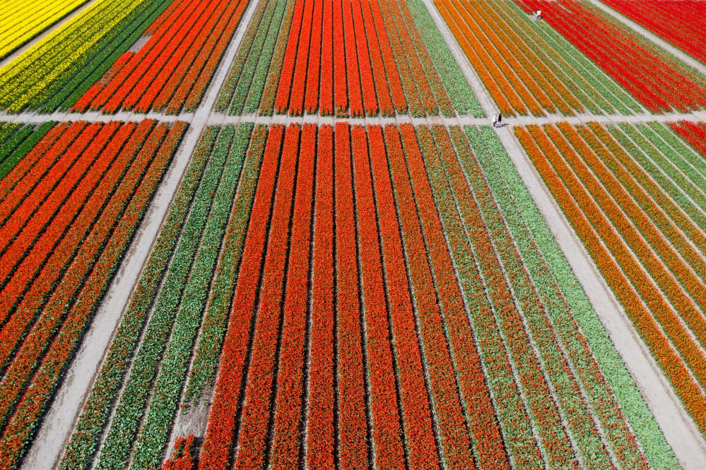 這是4月14日在荷蘭利瑟拍攝的郁金香花田(無人機照片)。新華社記者孟鼎博攝