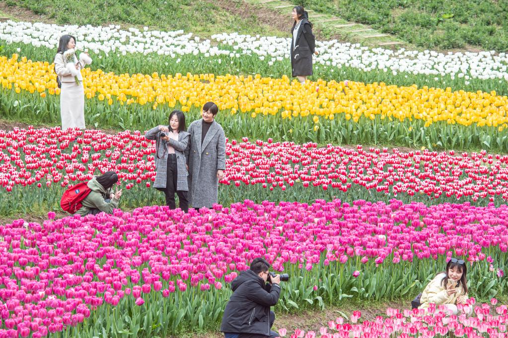 3月9日,在位于重慶市長壽區(qū)的長壽湖景區(qū),游客在郁金香花海中賞花拍照。景區(qū)今年一共從荷蘭進口郁金香種球近60萬粒,分三大系列27個品種,種植面積約12000平米。新華社記者唐奕攝