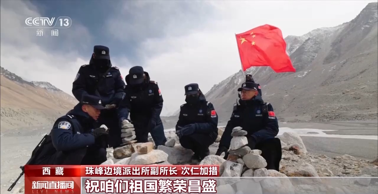珠峰邊境派出所副所長(zhǎng) 次仁加措:我們每次到這個(gè)地方,有一個(gè)儀式,就是把石頭壘在這里,表達(dá)我們的祝福。祝祖國(guó)繁榮昌盛,也祝我們心想事成。