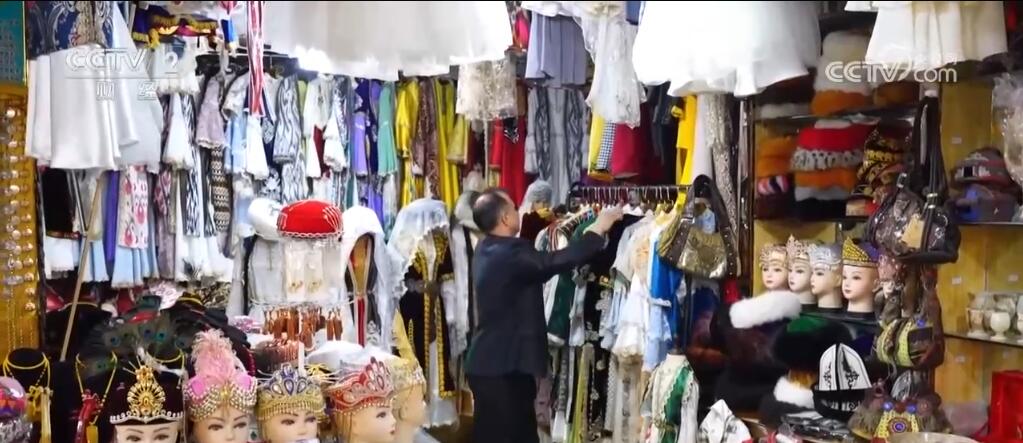 在總臺2024年春晚舞臺上,演員們身穿特色服飾進行表演,驚艷全場。春晚過后,慕名前來購買和定制艾特萊斯服飾的游客不斷增加。努爾·買買提原本在當?shù)亟?jīng)營一家數(shù)碼產(chǎn)品店鋪,看到旅拍店艾特萊斯服飾等傳統(tǒng)民族服裝的租賃和定制需求增加,他便在喀什古城開了一家民族服裝綜合店。