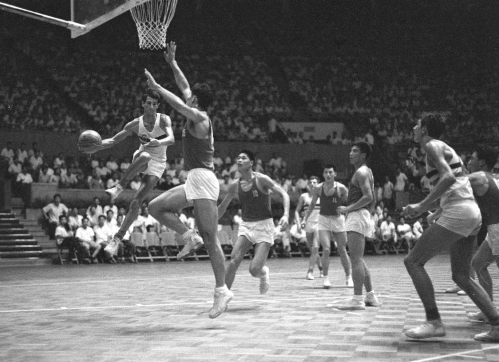 ↑1966年7月31日,法國男子籃球隊同中國男子籃球隊在北京工人體育館進(jìn)行訪華首場友誼賽。