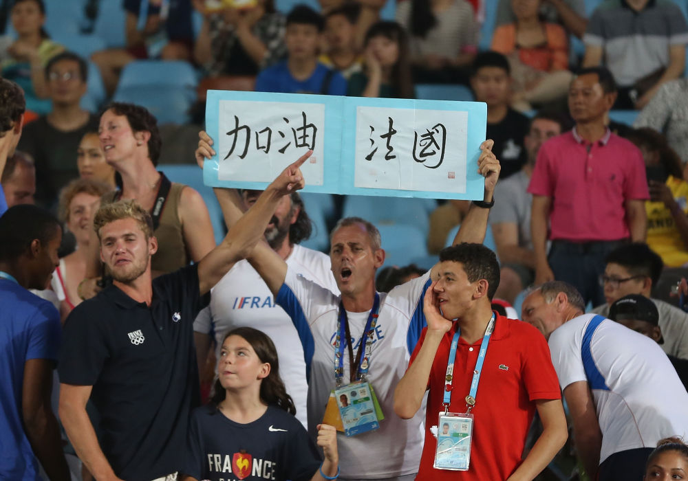 ↑2014年8月25日,一名法國觀眾在南京青奧會田徑項目男子標(biāo)槍決賽場邊高舉用中文書寫的“加油法國”標(biāo)語為法國選手盧卡斯·穆塔德加油。