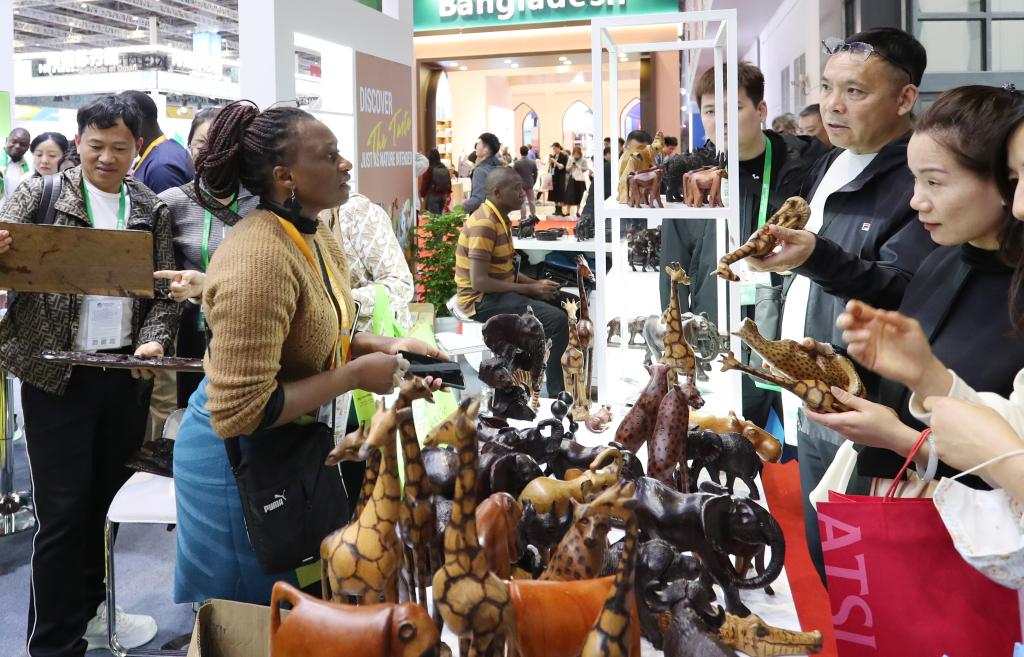 2023年11月6日,來(lái)自津巴布韋的艾薇頓絲·察卡瓦在展臺(tái)向參觀者介紹木雕展品。這是她第一次來(lái)到中國(guó)上海參加進(jìn)博會(huì),這些木雕都是她的哥哥在家里制作的,她想通過(guò)進(jìn)博會(huì)為哥哥的木雕作品找到好的銷(xiāo)路。新華社記者方喆攝