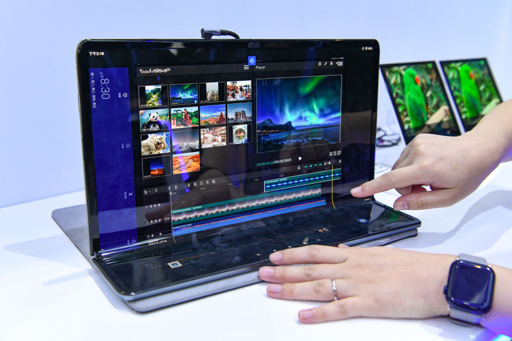 在“2023世界顯示產(chǎn)業(yè)大會(huì)新型顯示創(chuàng)新成果展”現(xiàn)場(chǎng),工作人員展示京東方折疊顯示屏。新華社記者唐文豪 攝