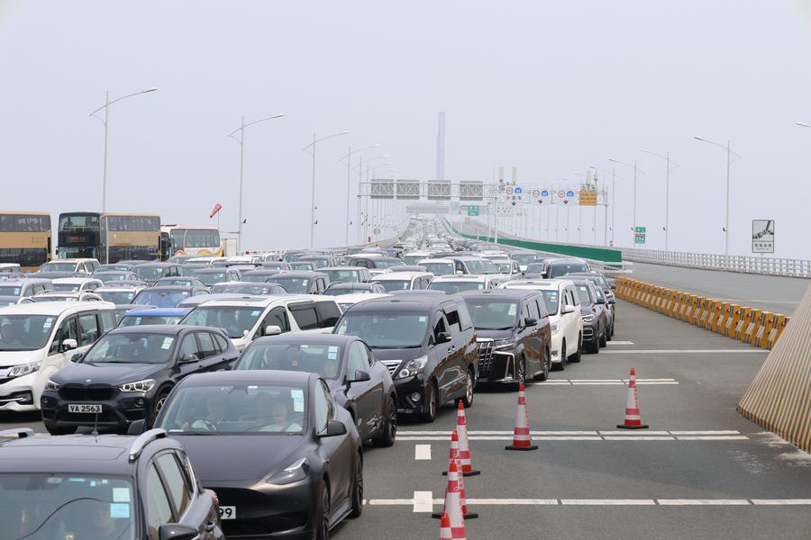 2024年3月9日拍攝的港珠澳大橋橋頭等待北上的車輛。港珠澳大橋邊檢站的數(shù)據(jù)顯示,截至3月9日21時,經(jīng)該站查驗的出入境“港車北上”車輛已突破50萬輛次。邊檢部門介紹,自2023年7月1日“港車北上”政策正式實施以來,駕駛單牌私家車“北上”的香港居民數(shù)量持續(xù)上升。 新華社發(fā)(王相國攝)