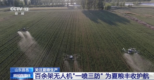 眼下正是小麥灌漿關(guān)鍵期,在山東省昌邑市柳疃鎮(zhèn)青阜農(nóng)業(yè)綜合體的一片高標(biāo)準(zhǔn)農(nóng)田里,幾架飛防無人機(jī)一字排開,白色水霧均勻噴灑在綠油油的麥田里。