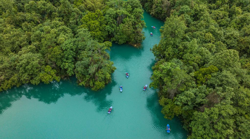 游客在荔波縣小七孔景區(qū)劃船游玩(5月16日攝,無(wú)人機(jī)照片)。新華社記者 陶亮 攝