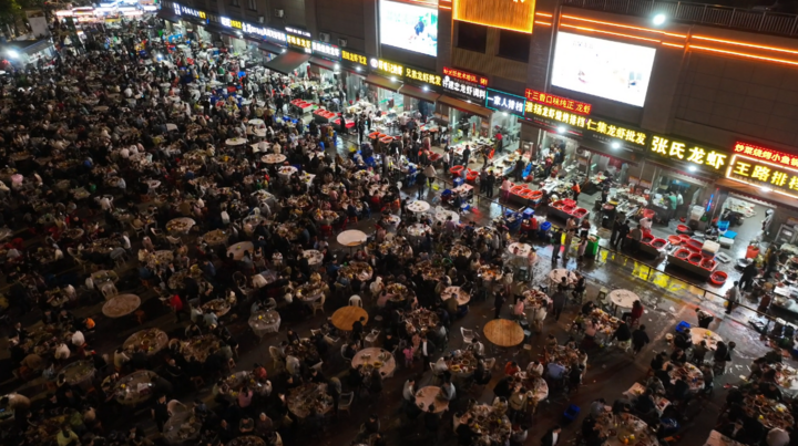 在江蘇盱眙的大桐農(nóng)貿(mào)市場(chǎng),聚集著數(shù)十家以經(jīng)營(yíng)小龍蝦為主的餐飲店、大排檔。暮色降臨,數(shù)千平方米的露天廣場(chǎng)上,游客座無(wú)虛席,空氣中彌漫著撲鼻香氣。