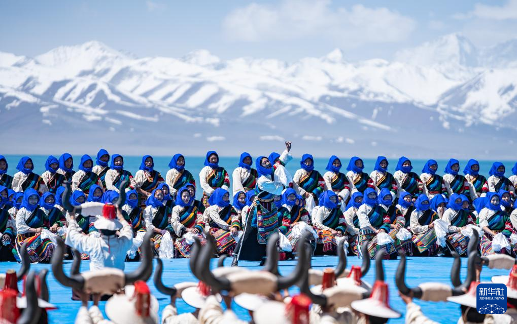 舞蹈演員正在納木錯開湖活動現(xiàn)場表演(5月19日攝)。