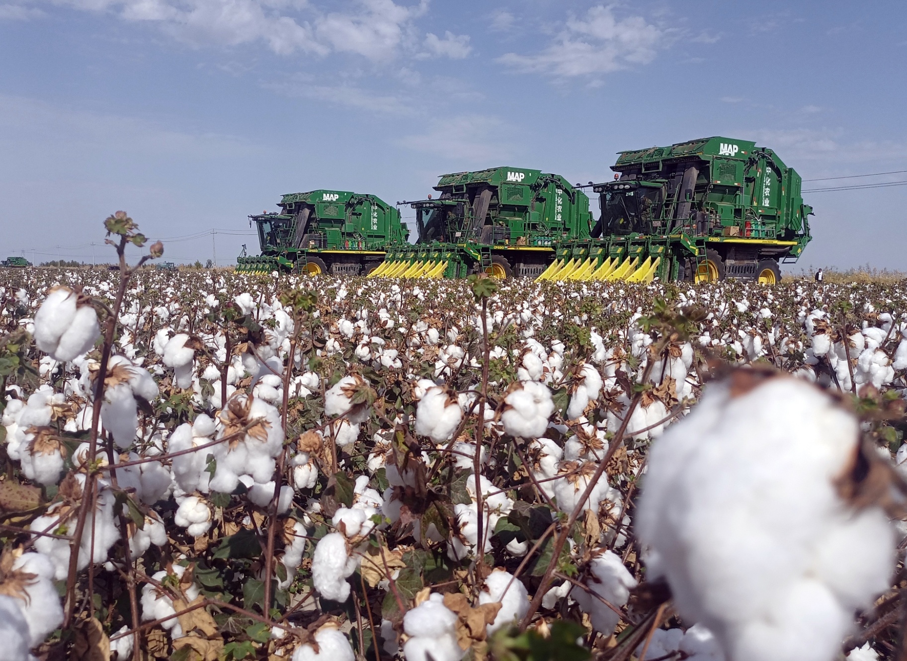 新疆塔城,采棉機(jī)采收沙灣市老沙灣鎮(zhèn)老沙灣新村向陽農(nóng)業(yè)專業(yè)合作社的棉花。