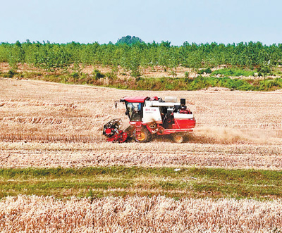 一片金黃的麥田里,撥禾輪轉(zhuǎn)動,麥芒飛揚,麥粒傾瀉而下……就在23日,蔡華從早忙到晚,沒敢停歇:“預(yù)報有雨,我得趕緊把客戶家的80多畝地收完?!碧烊谙聛恚虐咽崭顧C停進車棚,麥香味瞬間涌進小院。累了一整天,剛吃完飯,蔡華又和妻子張秀蘭盤算起出發(fā)的行頭:對講機、收款二維碼……