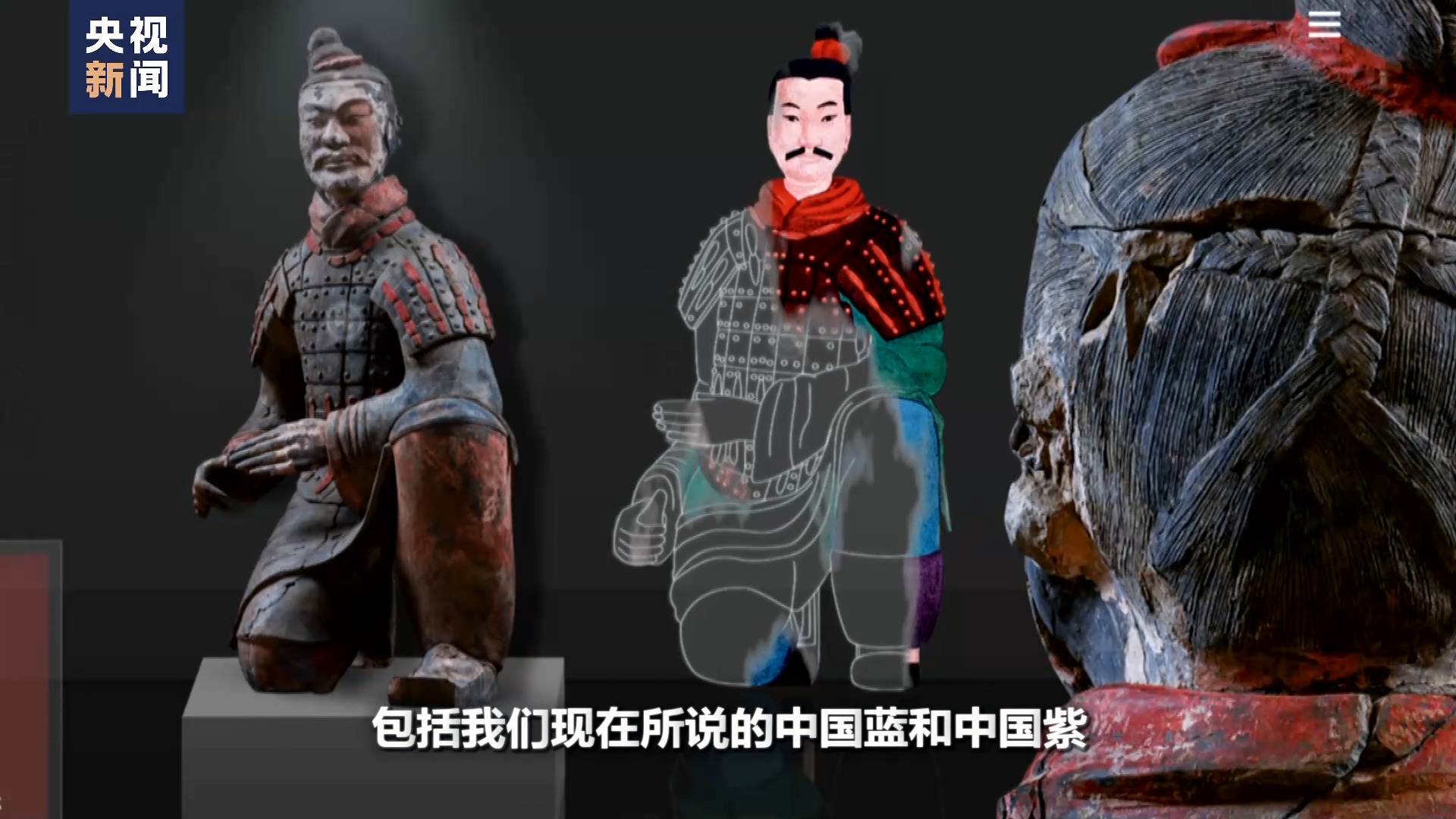 秦始皇帝陵博物院文物保護(hù)修復(fù)專家 蘭德?。?/strong>那么這在秦俑實(shí)際上,目前有八種顏色。紅、黃、綠、藍(lán)、紫、白、黑、粉等等,這就是已經(jīng)定型的八種。但是我們最近也要分析比這個(gè)還要多,包括有一些它是白里透紅的粉色,還有的它就是幾種合成色,包括我們現(xiàn)在所說的中國(guó)藍(lán)和中國(guó)紫。