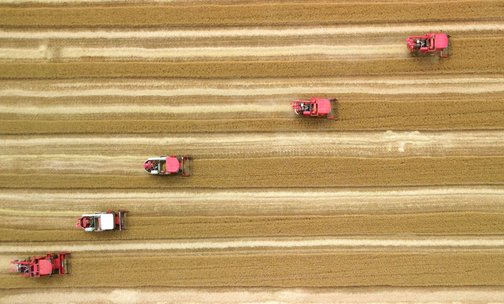 6月2日,在山東省臨沂市郯城縣廟山鎮(zhèn),參加小麥機(jī)收減損技能大比武的農(nóng)機(jī)手駕駛聯(lián)合收割機(jī)收獲小麥(無(wú)人機(jī)照片)。新華社記者 徐速繪 攝