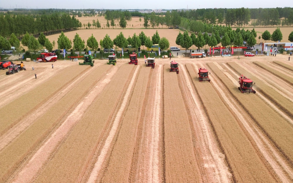 麥浪翻滾,沃野生金。麥田中,10臺(tái)收割機(jī)依次排開(kāi);一聲令下,農(nóng)機(jī)手駕駛收割機(jī)勻速前行,風(fēng)中搖曳的麥穗被吸入“腹中”,田間只剩下短短的麥茬。