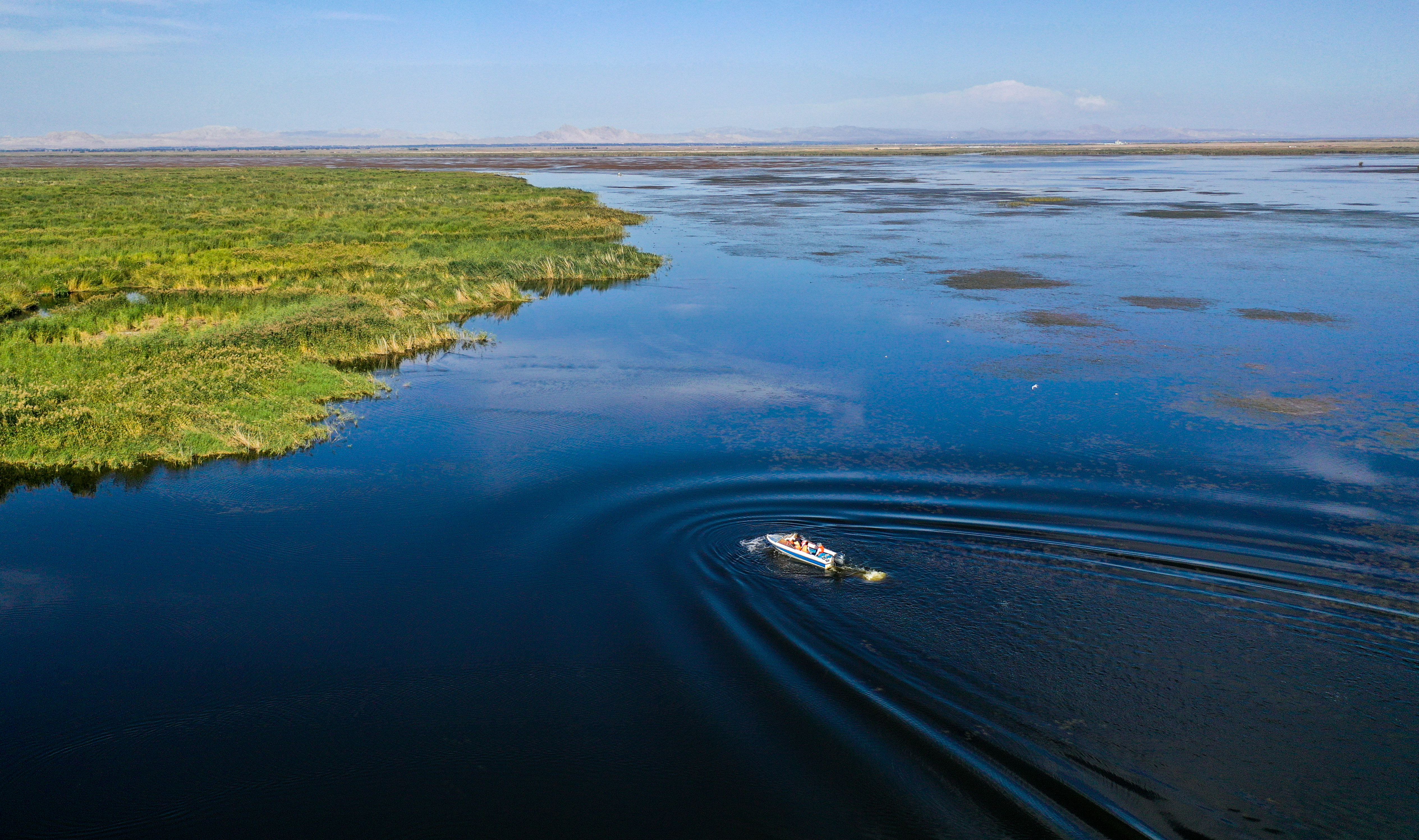 內(nèi)蒙古烏梁素海湖面上,河湖濕地水環(huán)境保護(hù)與修復(fù)技術(shù)研究團(tuán)隊(duì)成員乘坐快艇去采集湖水樣本(2023年9月15日攝,無(wú)人機(jī)照片)。新華社記者 連振 攝