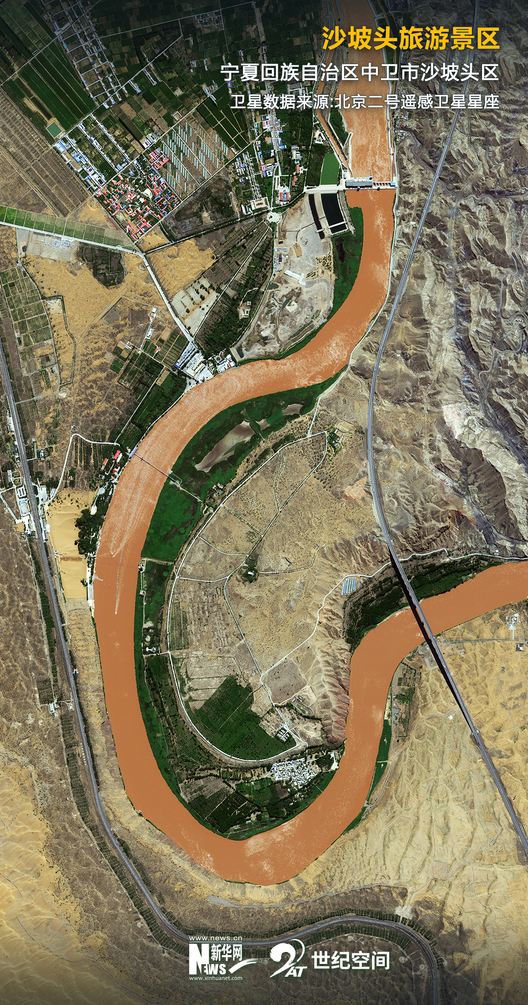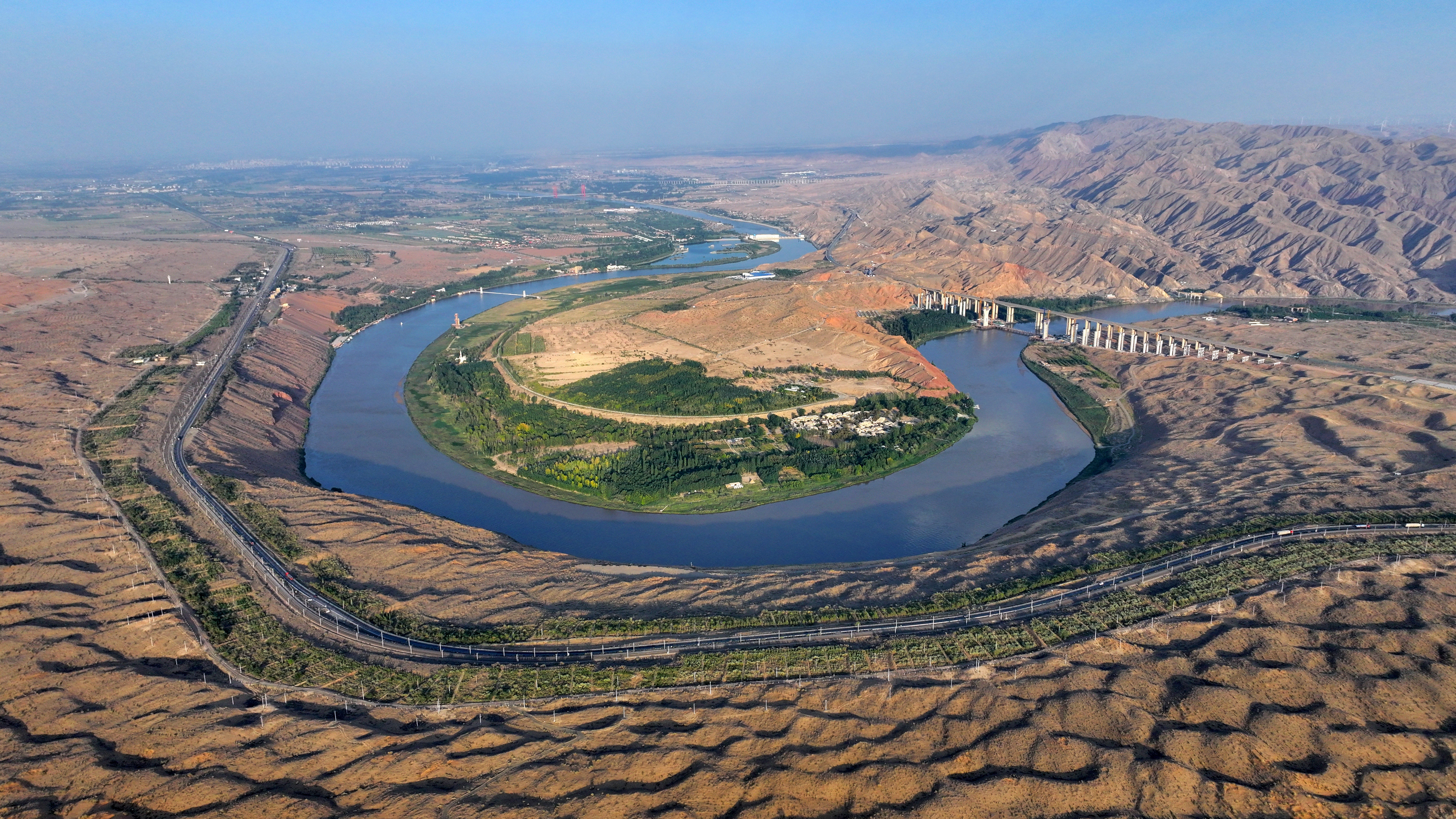 如今,在當(dāng)?shù)赜嘘P(guān)部門開(kāi)展的水系疏浚工程影響下,這里成為沙漠濕地的聚集地。黃河流經(jīng)此地,畫出了一道蜿蜒的曲線。河的一頭是騰格里沙漠的無(wú)垠瀚海,另一頭被一抹蒼翠鑲嵌在河岸邊。