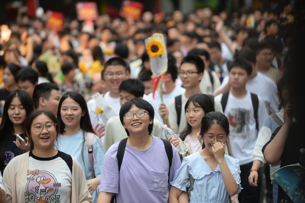 考生們從考場魚貫而出,家長們送上鮮花和擁抱,大家合影留念,記錄下青春歲月里的難忘時刻……
