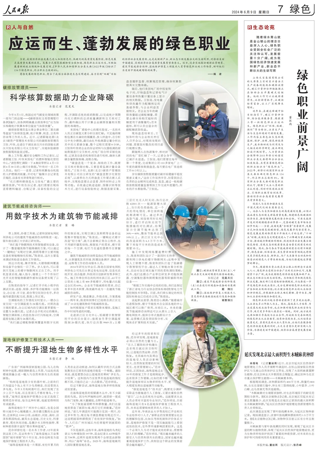 蓬勃發(fā)展的綠色職業(yè),契合了我國全面推進生態(tài)文明建設(shè)、奮力實現(xiàn)“雙碳”目標的經(jīng)濟社會發(fā)展需要,也是我國新產(chǎn)業(yè)、新業(yè)態(tài)不斷發(fā)展壯大的生動寫照,對推動美麗中國建設(shè)、實現(xiàn)經(jīng)濟社會高質(zhì)量發(fā)展有重要意義。近日,人民日報記者實地探訪碳排放管理員、建筑節(jié)能減排咨詢師、濕地保護修復(fù)工程技術(shù)人員等綠色職業(yè)的工作場景,傾聽他們?yōu)槊利愔袊鴾p碳增綠的故事。