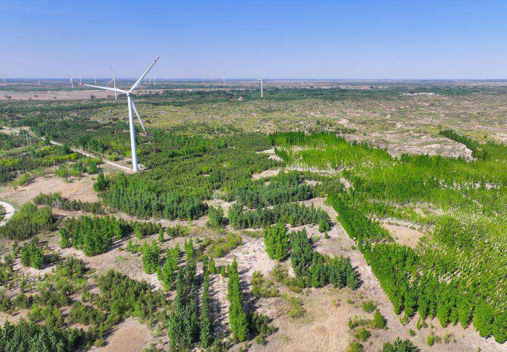 這是在內(nèi)蒙古通遼市科爾沁沙地“雙百萬畝”綜合治理工程努古斯臺項目區(qū)拍攝的風(fēng)力發(fā)電機(jī)組(2024年5月15日攝,無人機(jī)照片)。新華社記者 連振 攝