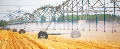 6月17日,在山東省東營市廣饒縣李鵲鎮(zhèn)前艾家村的田地里,農(nóng)民正在使用桁架式噴灌機澆地。