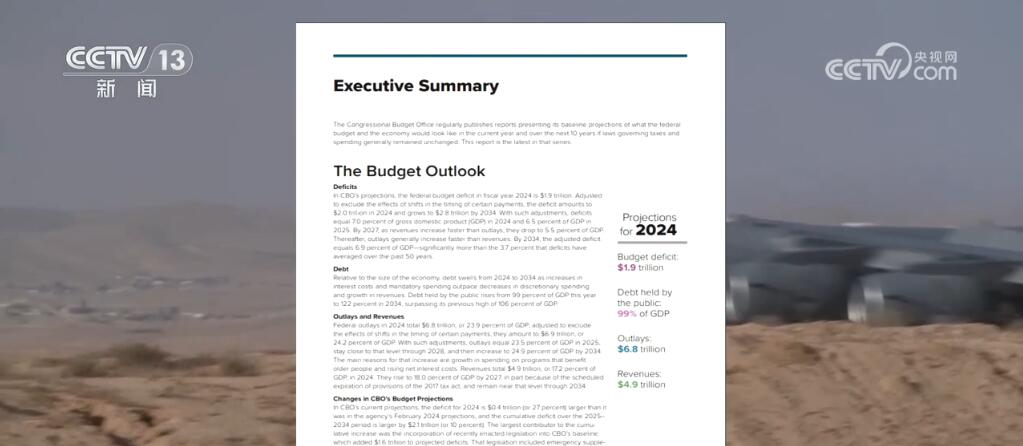 美國國會(huì)預(yù)算辦公室18日發(fā)布報(bào)告稱,在2024財(cái)年,聯(lián)邦政府預(yù)算赤字預(yù)計(jì)將達(dá)到1.9萬億美元。
