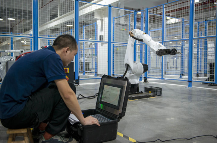 在廣東拓斯達科技股份有限公司,工作人員對一臺工業(yè)機器人進行絕對定位精度的校準(5月17日攝)。新華社記者 徐嘉懿 攝
