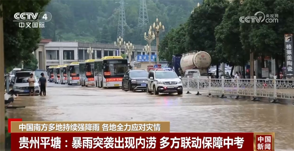 受強降雨的影響,23日,貴州平塘縣低洼路段出現(xiàn)內(nèi)澇。恰逢當(dāng)?shù)刂锌甲詈笠惶?,為保障學(xué)生順利參考,平塘縣第一時間啟動應(yīng)急預(yù)案,引導(dǎo)接送考生車輛安全行駛。