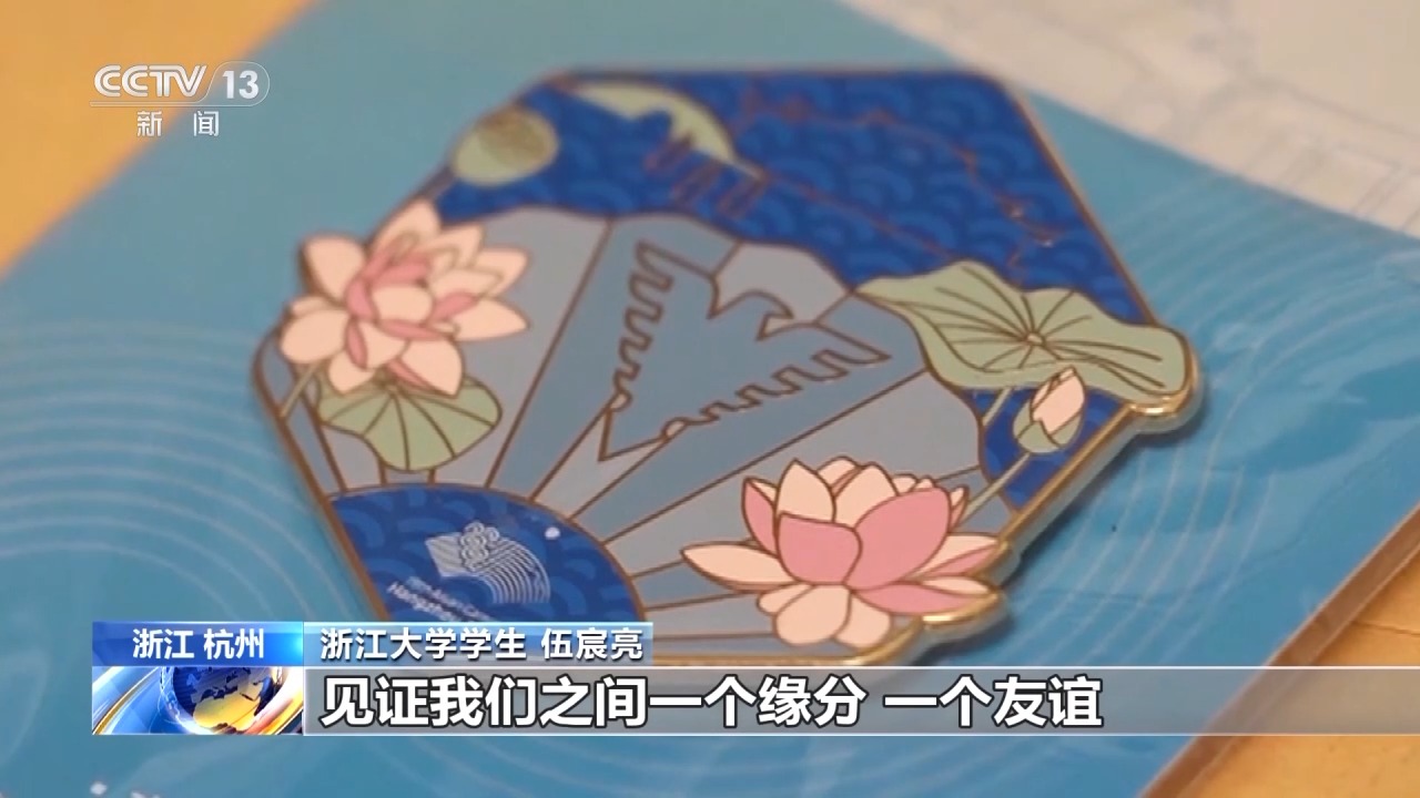 浙江大學(xué)學(xué)生 伍宸亮:這個(gè)徽章是浙江大學(xué)在去年的杭州亞運(yùn)會(huì)、亞殘運(yùn)會(huì)期間為志愿者設(shè)計(jì)的一個(gè)專屬的徽章,在徽章設(shè)計(jì)的過(guò)程中,它是全由我們同學(xué)自己設(shè)計(jì)的,也希望以這枚徽章,見(jiàn)證我們之間的緣分和友誼。
