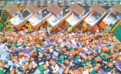 圖為江蘇省宿遷經(jīng)濟(jì)技術(shù)開(kāi)發(fā)區(qū)郵政郵件處理中心,工作人員在進(jìn)行分揀。