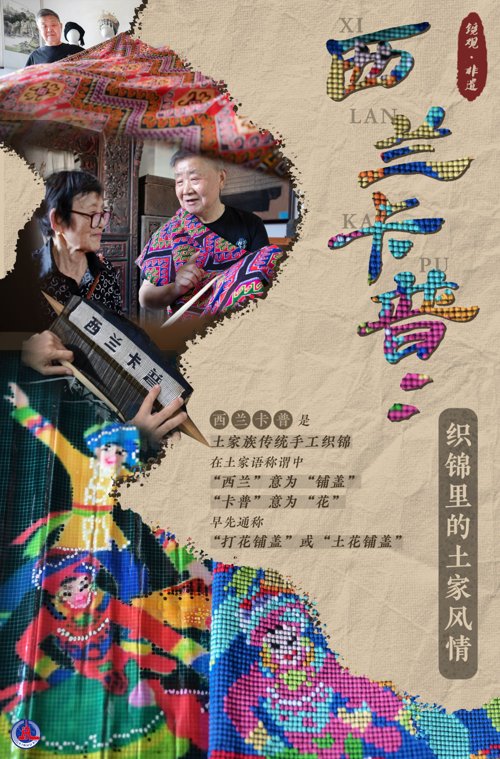 西蘭卡普是土家族傳統(tǒng)手工織錦,在土家語(yǔ)稱(chēng)謂中,“西蘭”意為鋪蓋,“卡普”意為花,早先通稱(chēng)“打花鋪蓋”或“土花鋪蓋”。土家孩子出生時(shí)外婆要送織錦,嬰幼兒時(shí)要蓋織錦,女孩子自小學(xué)習(xí)織錦,出嫁時(shí)在織機(jī)上制作西蘭卡普作為陪嫁。西蘭卡普記錄了土家族的風(fēng)俗和情感,與土家人的生活息息相關(guān),被譽(yù)為土家族的“五彩活化石”,2006年被列入國(guó)家級(jí)非物質(zhì)文化遺產(chǎn)名錄。
