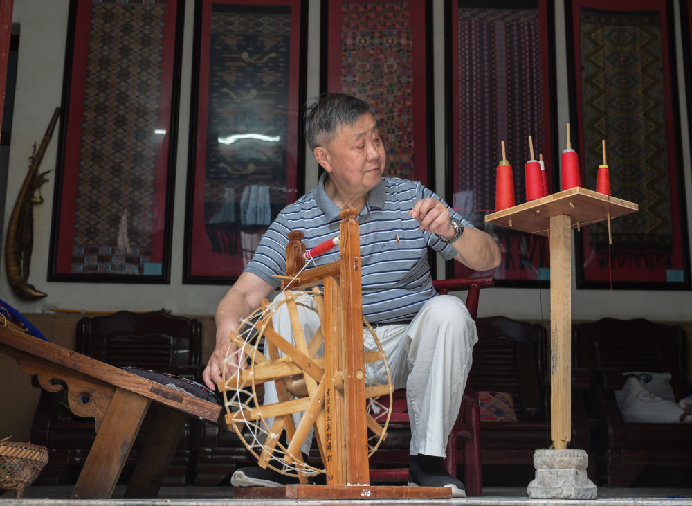 7月3日,湖北省來(lái)鳳縣桂花樹(shù)社區(qū),唐洪祥在紡線(xiàn)。