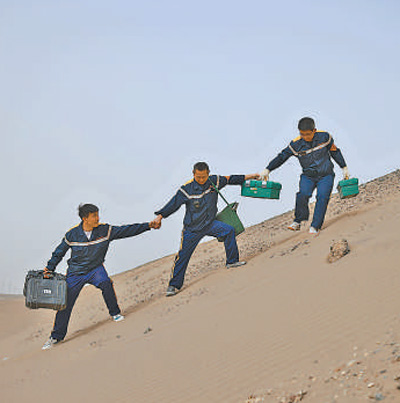 班組成員在翻越沙丘。 2014年,烏魯木齊西車輛段哈密動(dòng)態(tài)檢測車間哈羅班組正式成立,負(fù)責(zé)維護(hù)哈羅鐵路沿線設(shè)備。10年來,哈羅班組堅(jiān)守在環(huán)境惡劣、條件艱苦的羅布泊,克服重重困難,做好鐵路巡檢和故障維修,保障鉀肥運(yùn)輸。 羅布泊,位于新疆東南部塔克拉瑪干沙漠邊緣,天上無飛鳥,地上不長草,只有漫無邊際的沙漠、戈壁、鹽堿灘。 這里一年中有200多天風(fēng)沙肆虐,夏季氣溫超過50攝氏度,冬季氣溫低至零下30攝氏度。這里是中國鐵路烏魯木齊局集團(tuán)有限公司烏魯木齊西車輛段哈密動(dòng)態(tài)檢測車間哈羅班組工作的地方。 是什么讓他們選擇到羅布泊工作?又是什么工作值得他們在這里堅(jiān)守10年? “鐵路修到哪兒,人員就要配到哪兒” 嗚—— “火車進(jìn)站了,快!” 哈羅班組工長臺欣龍和伙伴們沖向站臺,幾個(gè)人一下子堵在了車門前。 “老吳,這回有啥?” “今兒有羊肉、雞蛋,還有一袋子番茄?!?/p> “嘿嘿嘿?!?/p> 車門旁,幾個(gè)大小伙兒咧著嘴憨笑。 臺欣龍工作的地方,叫羅中站,是哈羅鐵路的最后一站,地處羅布泊中心。這里雖通了電、通了水,但米、面、糧、油、飲用水等生活物資全靠火車從400公里外的哈密市送來。 “大小伙兒們,自己搬水?!绷熊囬L老吳一聲令下,臺欣龍和伙伴們麻利地爬上車,一人扛下一桶15升的礦泉水。 “這兒的水堿性大,一燒開,全是白粒粒,沒法喝?!迸_欣龍說,這15升礦泉水得撐一周。 在羅中站,差不多每隔5天會有通勤列車抵達(dá),送來各類物資。 列車停留5小時(shí),隨即返程。羅中站經(jīng)歷短暫的熱鬧后,再次回歸平靜。 除了人少、地荒、物資緊,寂寞、單調(diào)或許是在羅中站工作、生活面臨的最大困難。 這里沒有商店、沒有飯館、沒有影院。白天,手機(jī)還能有網(wǎng)絡(luò)信號,晚上則幾乎沒有信號。乒乓球、象棋以及少量書籍,為臺欣龍和伙伴們提供了少有的娛樂方式。 2014年,中國鐵路烏魯木齊局集團(tuán)有限公司烏魯木齊西車輛段哈密動(dòng)態(tài)檢測車間哈羅班組正式成立,負(fù)責(zé)維護(hù)哈羅鐵路沿線設(shè)備。當(dāng)年,剛畢業(yè)的臺欣龍來到了這里。 當(dāng)時(shí)也沒想太多,覺得在哪里都是干活,就接受了單位安排?!拌F路修到哪兒,人員就要配到哪兒,這活總得有人干?!迸_欣龍說。 如今,哈羅班組共有7人,大伙兒隔10天輪一次班。班組里年齡最大的丁鵬今年51歲了,最小的永志帥和杜權(quán)也已31歲。 “假如某個(gè)檢測站發(fā)出故障警報(bào),無論什么天氣,都必須立即響應(yīng)” 凌晨3時(shí)20分,顛簸了近5個(gè)小時(shí),臺欣龍和兩名隊(duì)員到達(dá)了黑龍峰動(dòng)態(tài)設(shè)備檢測站。這里,距離羅中站230公里。 夜間出行,沒有道路、沒有路燈、沒有導(dǎo)航,臺欣龍駕駛著皮卡車朝著鐵路延伸的方向在茫茫戈壁灘里蹚出路。這一路大坑套小坑,人的腦袋時(shí)不時(shí)頂?shù)杰図?,撞得生疼?/p> 下了車,風(fēng)裹著沙子打在臉上、頭燈上,幾乎掩蓋了說話聲。時(shí)間長了,臺欣龍和隊(duì)友們便形成了默契,只需一個(gè)手勢,便知道對方的意思。 4時(shí)10分,臺欣龍和隊(duì)友開始作業(yè)。 打開紅外線軸溫探測設(shè)備(THDS)的機(jī)蓋,映入眼簾的是一層厚厚的沙塵。臺欣龍熟練地拿出吹風(fēng)機(jī)、毛刷,仔細(xì)清理室外探頭箱里的沙塵,再把黑體(一種檢測設(shè)備)放置在探頭箱上,進(jìn)行溫度檢測校準(zhǔn)。 “我們這里夏季溫度高,若列車輪對軸溫超標(biāo),就有斷軸風(fēng)險(xiǎn),引發(fā)安全事故。檢測儀器必須保證準(zhǔn)確性。”臺欣龍解釋,根據(jù)標(biāo)準(zhǔn),THDS低溫檢測誤差正負(fù)不得超過2攝氏度,高溫時(shí)段不得超過3攝氏度?!暗覀冏约旱囊笫菍⒄`差控制在1攝氏度。” 早晨7時(shí),臺欣龍一行結(jié)束檢測任務(wù),踏上了回程路,直到中午12時(shí)才趕回駐地。 “今天這一路,算順利的?!迸_欣龍說,“假如某個(gè)檢測站發(fā)出故障警報(bào),無論什么天氣,都必須立即響應(yīng)?!痹诹_布泊,沙塵暴說來就來,一刮就是三四個(gè)小時(shí)。有一回,他們遇上特大沙塵暴,風(fēng)暴像堵墻一樣迎面撲來。越野車迎風(fēng)的一側(cè),車漆幾乎全被風(fēng)沙打掉。“幸虧附近有座橋涵,大伙兒在里頭躲了3個(gè)多小時(shí)。”風(fēng)暴過后,衣服上、頭發(fā)上、耳朵里、鼻孔里全都是沙子。一抬腳,鐵道路基上的風(fēng)沙已沒過膝蓋。 還有一次,冬季雪夜,臺欣龍和隊(duì)友們?nèi)ヌ幚砭o急故障。大雪的掩蓋,讓茫茫戈壁更難辨認(rèn)方向?!拔覀円徊恍⌒淖咤e(cuò)了方向,跑了很多冤枉路,最終汽車油料不足,只能請求救援,天亮了才出來。”臺欣龍說。 “檢修得跟上,為鉀肥運(yùn)輸做好保障” 無水、無人、無城,哈羅鐵路為何要修往羅布泊? 原來,羅布泊寸草不生的地表之下,藏著世界上最大的硫酸鹽型含鉀鹵水礦床,占全國鉀資源量的三成。 長期以來,我國耕地面積中一半以上缺鉀,偏偏鉀鹽在我國屬稀缺礦種,農(nóng)民此前用的鉀肥,85%以上依賴進(jìn)口。羅布泊的發(fā)現(xiàn),讓許多人興奮不已。 一批批創(chuàng)業(yè)者白手起家,讓羅布泊這個(gè)不毛之地長出了世界上最大的硫酸鉀生產(chǎn)廠——國投新疆羅布泊鉀鹽有限責(zé)任公司。最初,這些鉀肥都是通過