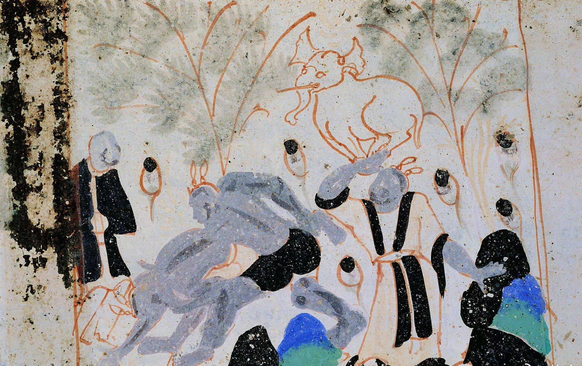 賽跑:圖中羽人奮力奔跑,腿呈一字形跨跳,騰空而起,雙手握飄帶,表現(xiàn)出凌空飛躍情景。莫高窟第249窟,西魏。