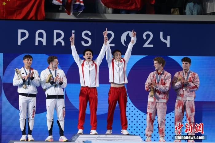 當(dāng)?shù)貢r間7月29日,在巴黎奧運(yùn)會跳水男子雙人十米臺決賽中,中國選手練俊杰/楊昊奪得金牌。圖為頒獎儀式。中新社記者 富田 攝