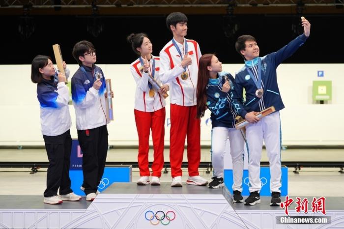 當(dāng)?shù)貢r間7月27日,在法國沙托魯舉行的巴黎奧運(yùn)會射擊10米氣步槍混合團(tuán)體決賽中,中國組合黃雨婷/盛李豪奪得金牌。這也是本屆巴黎奧運(yùn)會誕生的首枚金牌。圖為獲獎選手在頒獎儀式上自拍。中新社記者 趙文宇 攝