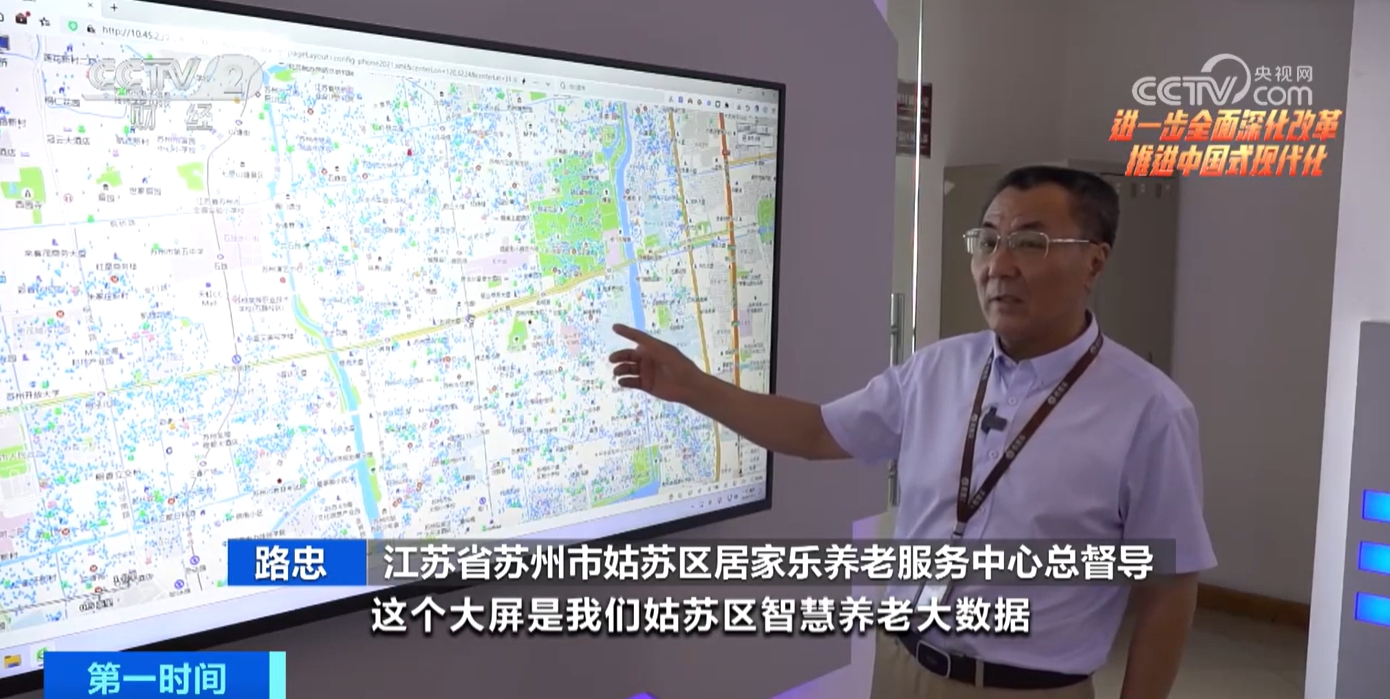 江蘇蘇州姑蘇區(qū)居家樂養(yǎng)老服務(wù)中心總督導(dǎo)路忠介紹,這個(gè)大屏是姑蘇區(qū)智慧養(yǎng)老大數(shù)據(jù)在線實(shí)時(shí)的數(shù)字地圖,粉色的點(diǎn)就是現(xiàn)在正在服務(wù)中的284戶老人,綠色的點(diǎn)位就是現(xiàn)在還有900多個(gè)老人在等待著上門服務(wù),大量的藍(lán)色的小點(diǎn)是服務(wù)用戶,是整個(gè)“虛擬養(yǎng)老院”的老人。