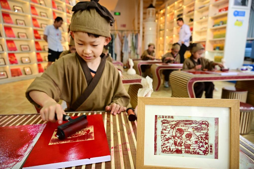 暑假期間,位于青島棧橋書店的印象國風藝術(shù)館舉行拓印研學(xué)活動,吸引學(xué)生前來學(xué)習(xí)、體驗。新華社記者 李紫恒 攝