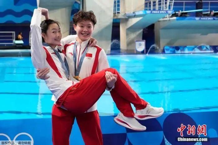資料圖:北京時間8月6日,在巴黎奧運(yùn)會跳水女子10米臺決賽中,東京奧運(yùn)會該項(xiàng)目冠軍得主全紅嬋成功衛(wèi)冕,陳芋汐獲得亞軍。圖為全紅嬋和陳芋汐相擁。