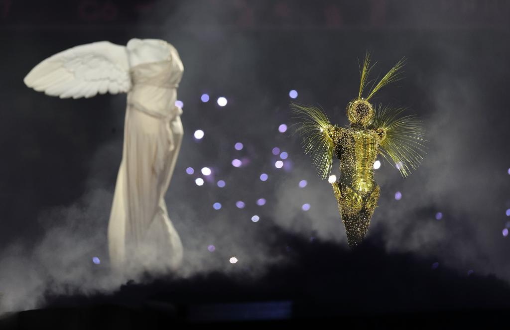 夜幕降臨,法蘭西體育場進入另一個時空——一個奧運會消失的世界。金色旅行者從天而降,隨著他的腳步,人們踏上一場夢幻般的探索。希臘國旗、奧運五環(huán)……與奧林匹克相關(guān)的遺跡逐漸被發(fā)掘。