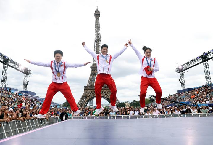 8月9日,中國舉重選手侯志慧(左)、李發(fā)彬(中)和羅詩芳在冠軍公園慶祝。當(dāng)日,觀眾來到位于法國巴黎特羅卡德羅廣場的冠軍公園,與奧運獎牌獲得者分享榮耀。新華社記者 雒圓 攝